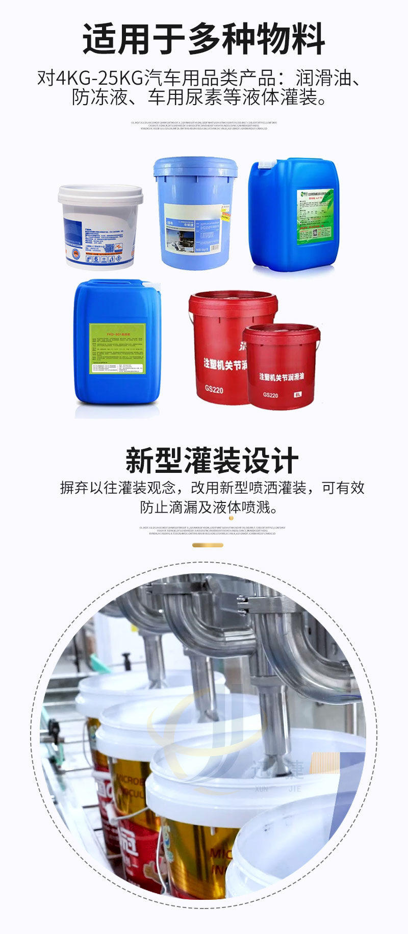 全自動(dòng)稱重式灌裝機(jī)適用于多種物料,對(duì)4kg-25kg汽車用品類產(chǎn)品:潤(rùn)滑油、防凍液、車用尿素等液體灌裝。