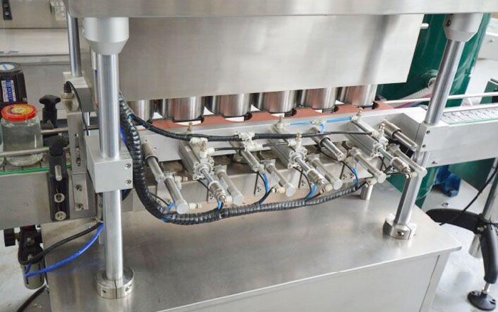 罐頭真空封蓋機(jī)用于調(diào)味品醬、水產(chǎn)罐頭、水果罐頭等采用目前環(huán)保的玻璃瓶包裝后對瓶內(nèi)真空度有比較高要求的三旋、四旋蓋的玻璃瓶進(jìn)行封蓋,本機(jī)配上真空系統(tǒng)后,能先對玻璃瓶內(nèi)進(jìn)行抽吸真空,然后再進(jìn)行旋蓋封口,以延長瓶內(nèi)容物的保質(zhì)期及增強(qiáng)口感,而且不用加熱以保持物料色澤不變。實(shí)行自動進(jìn)瓶、自動封蓋、自動進(jìn)行抽真空。