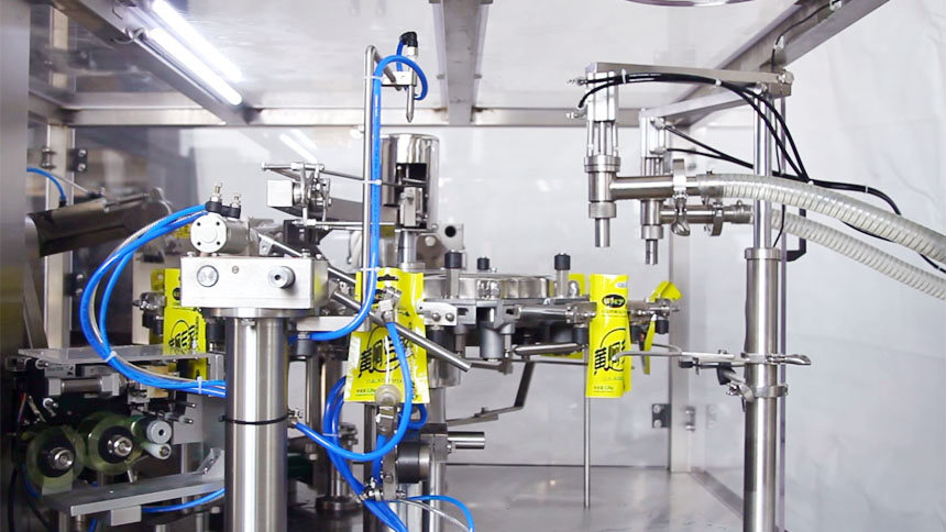 這套全自動給袋式液體醬體包裝機主要適用于液體/醬體類:洗滌劑、黃酒、醬油、米醋、果汁、飲料、番茄醬、花生醬、果醬、辣椒醬