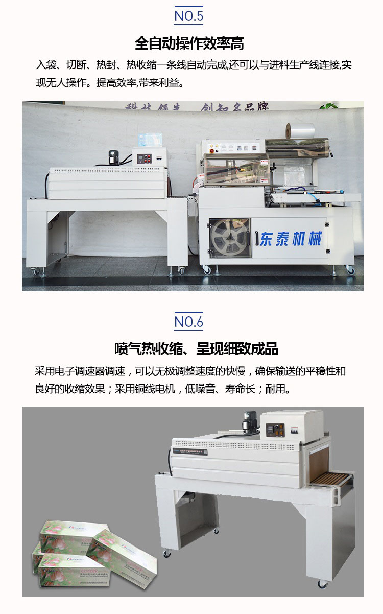 配合L型封切刀使收縮膜包裝一次封切成型,鍍特氟龍不粘層封口布,封切不黏膜,且封口整齊不開裂,產(chǎn)品經(jīng)封切后,進(jìn)入自動(dòng)塑料膜熱收縮包裝機(jī)完成包裝。