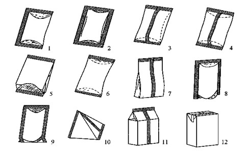 袋裝的形式多種多樣,可分為大袋和小袋。而用于食品銷(xiāo)售包裝的各種小袋主要有以下幾種。如下圖所示。