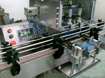 本機(jī)與物料接觸均為不銹鋼制作,完全符合GMP標(biāo)準(zhǔn)??焖倩罱舆B接,拆洗方便,灌裝量、灌裝速度均可調(diào)節(jié),更 換不同規(guī)格形狀的瓶子,不需更換零件,調(diào)整容易。另灌裝頭設(shè)有防滴漏裝置,灌裝無拉絲、滴漏;有瓶灌裝、無瓶不灌裝;設(shè)有計數(shù)功能,能準(zhǔn)確顯示當(dāng)前產(chǎn)量、 前班產(chǎn)量;并備有自動加料控制接口,實現(xiàn)對加料的自動控制。各動作平穩(wěn)、準(zhǔn)確無誤,是目前較為理想的機(jī)電氣一體化產(chǎn)品。(該設(shè)備需要配備輔助設(shè)備:真空泵,真空儲氣罐)
